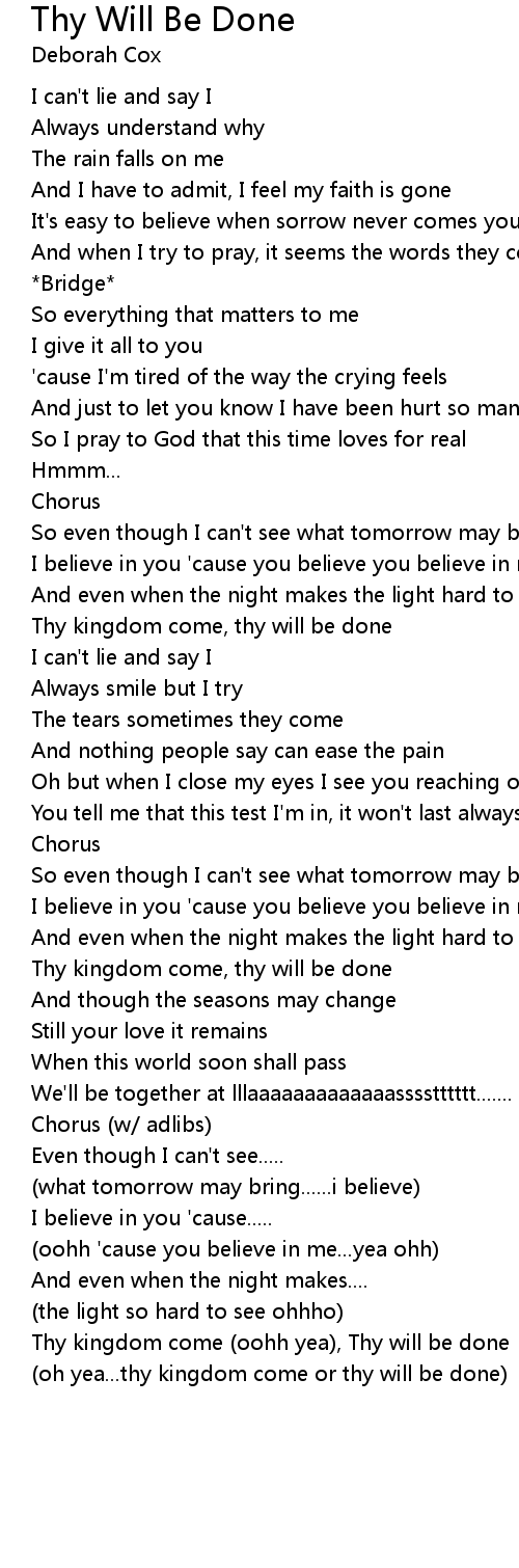 Thy kingdom come (oohh yea), Thy will be done |
