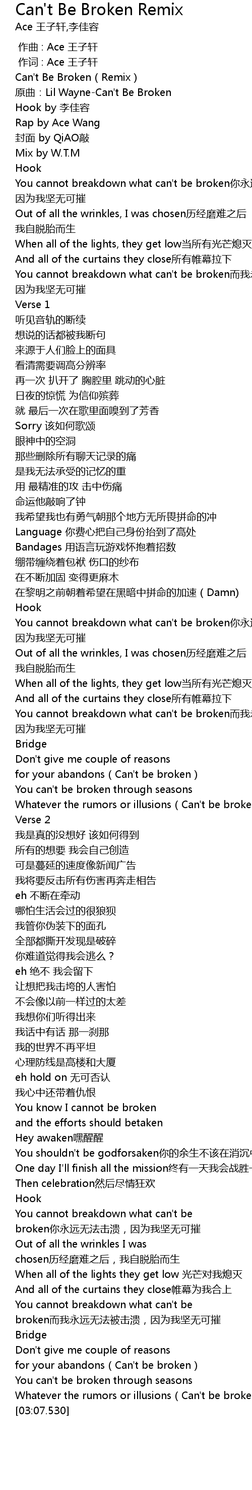 | [00:07.156] | 原曲:Lil Wayne-Can't Be Broken |