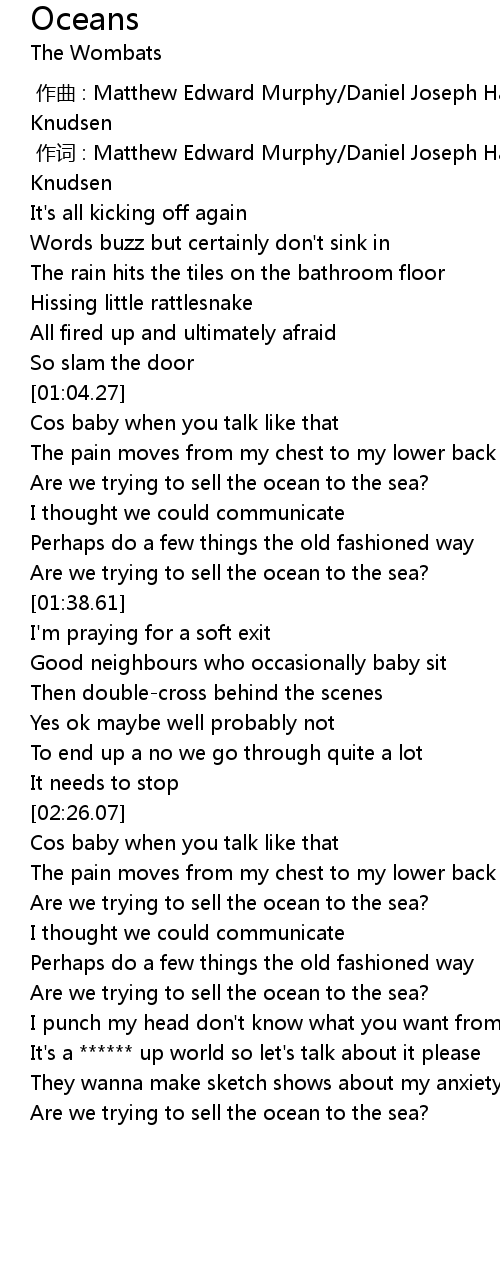 | [00:01.000] | 作词 : Matthew Edward Murphy/Daniel Joseph Haggis/Tord Oeverland Knudsen |