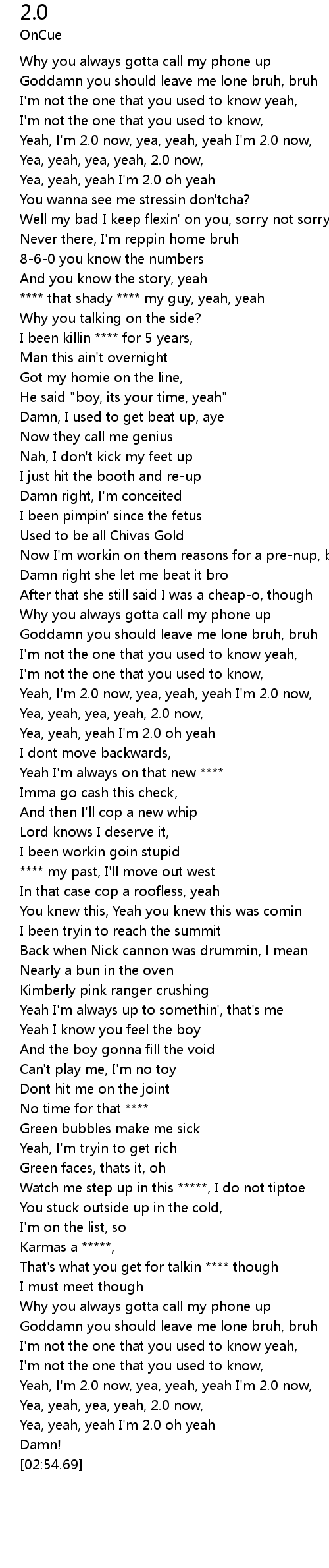 | [02:41.09] | Yeah, I'm 2.0 now, yea, yeah, yeah I'm 2.0 now, |