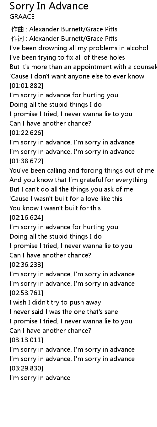 | [01:31.791] | I' m sorry in advance, I' m sorry in advance |