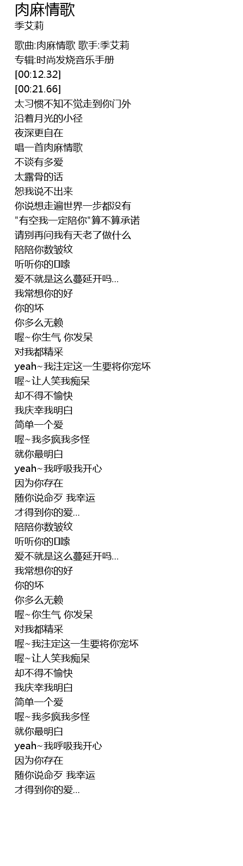 | [00:02.53] | 歌曲:肉麻情歌 歌手:季艾莉 |