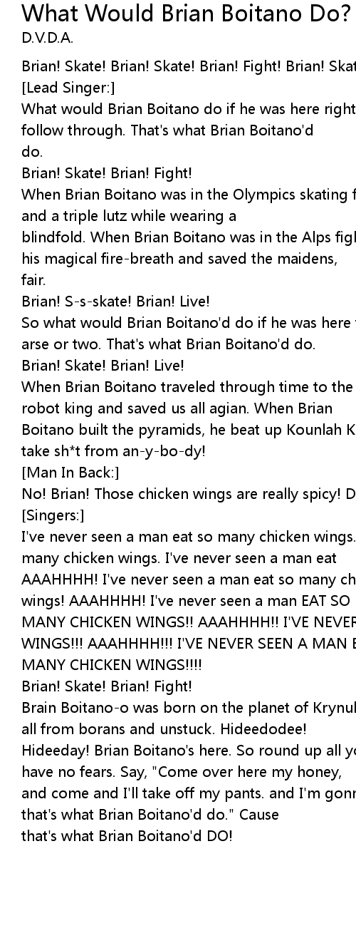 and come and I'll take off my pants. and I'm gonna make dirty love to you, cause that's what Brian Boitano'd do." Cause |
