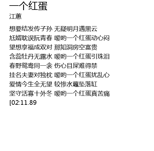 | [02:40.84] | 坚守活寡十外冬 嗳哟一个红蛋真苦痛 |