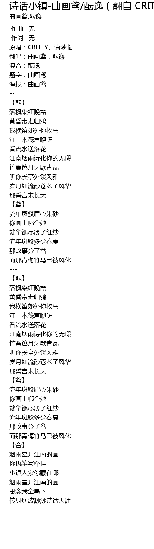 | [00:14.180] | 翻唱:曲画鸢,酝逸 |