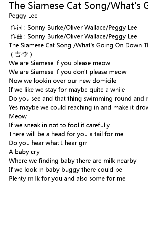 | [00:00.00] | The Siamese Cat Song What' s Going On Down There Peggy Lee jí lǐ |