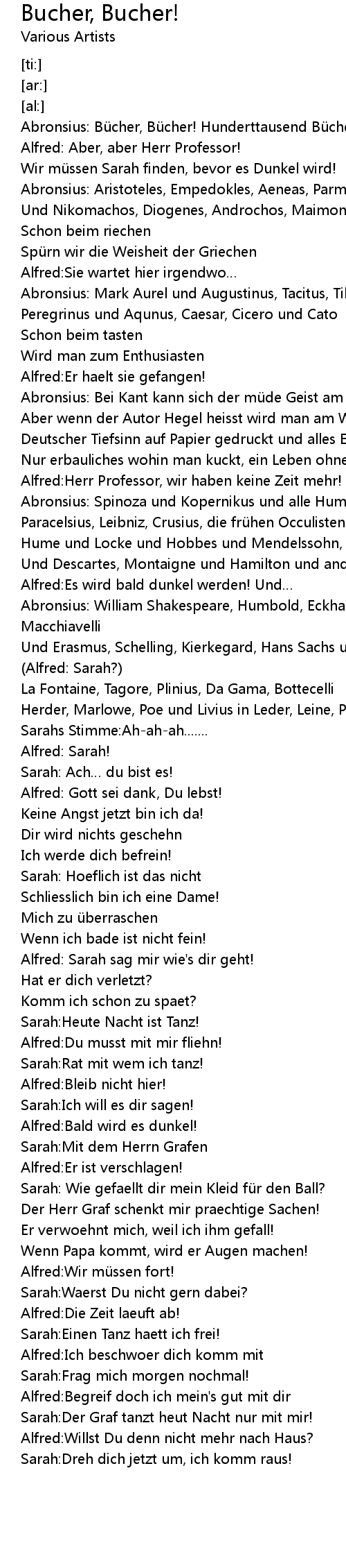 | [00:00.17] | Abronsius: Bücher, Bücher! Hunderttausend Bücher! |