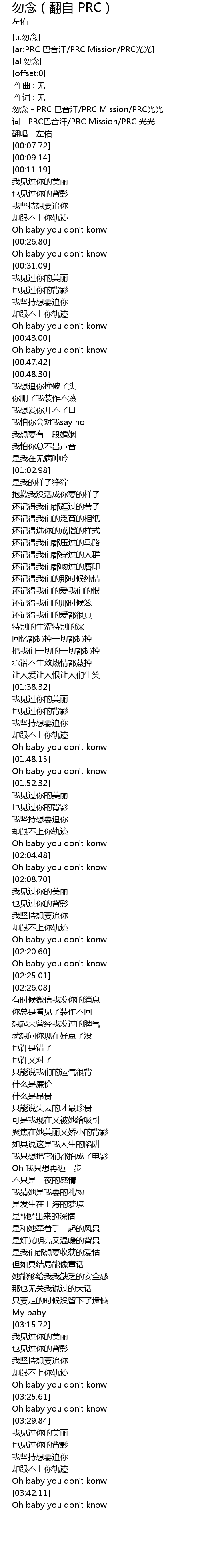 | [00:00.48] | 勿念 - PRC 巴音汗/PRC Mission/PRC光光 |