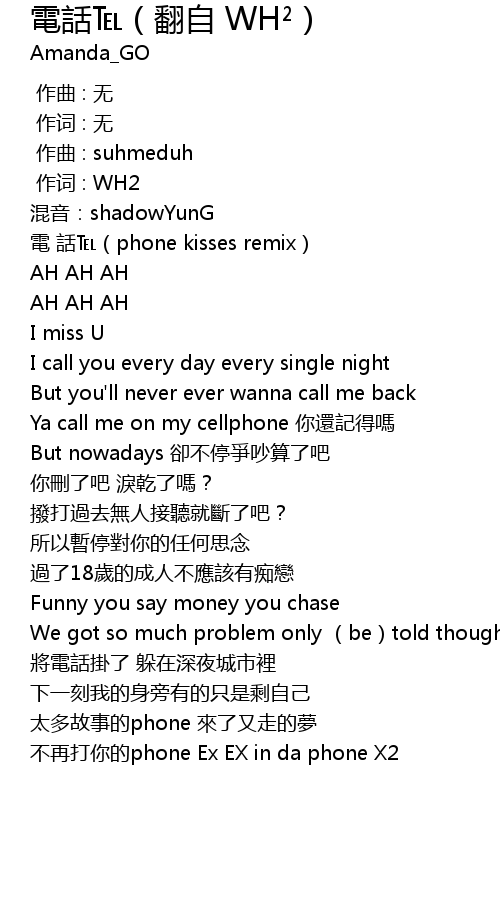 | [01:16.291] | bù zài dǎ nǐ de phone Ex EX in da phone X2 |