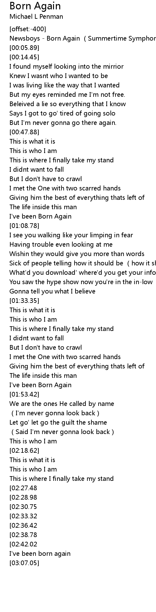 | [02:55.75][02:38.78] | I've been Born Again |