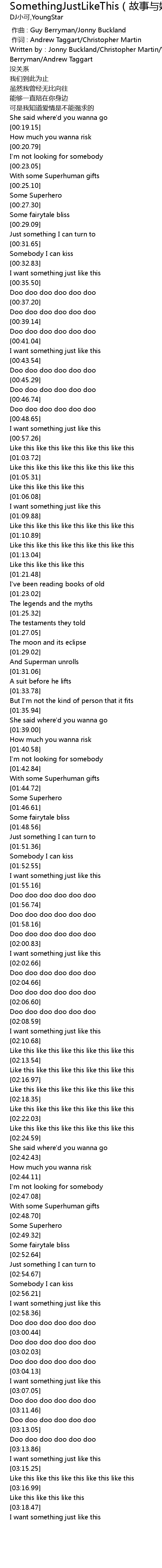 | [00:01.05] | Written by:Jonny Buckland/Christopher Martin/Will Champion/Guy Berryman/Andrew Taggart |