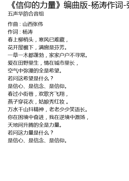 | Song | 《信仰的力量》编曲版-杨涛作词-张伟作曲编配 |