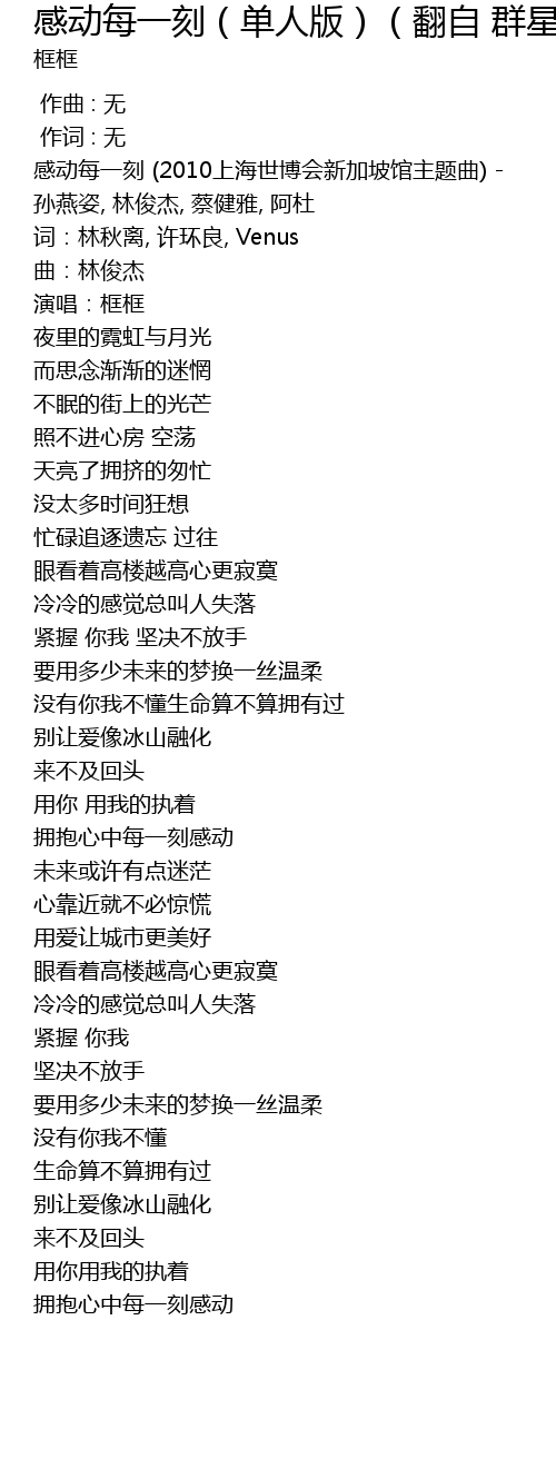 | [00:00.45] | 感动每一刻 (2010上海世博会新加坡馆主题曲) - 孙燕姿, 林俊杰, 蔡健雅, 阿杜 |