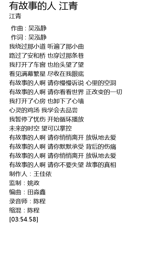 | [00:52.30] | 有故事的人啊 请你慢慢诉说 心里的空洞 |