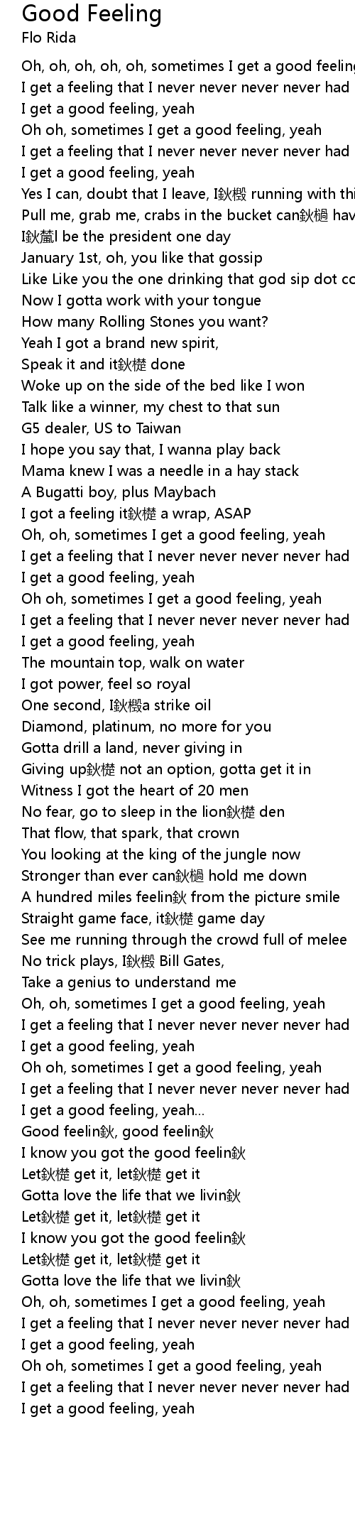 | [00:06.38] | Oh, oh, oh, oh, oh, sometimes I get a good feeling, yeah |