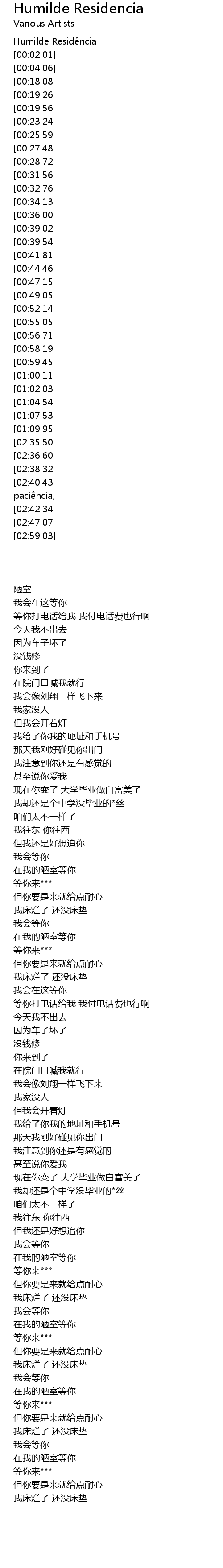 | [02:46.91][02:36.60][02:25.88][01:11.04] | Na minha humilde resid ncia |