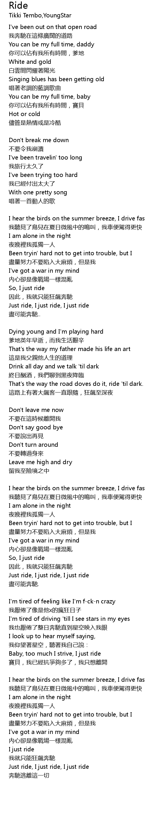 | Baby, too much I strive, I just ride | |