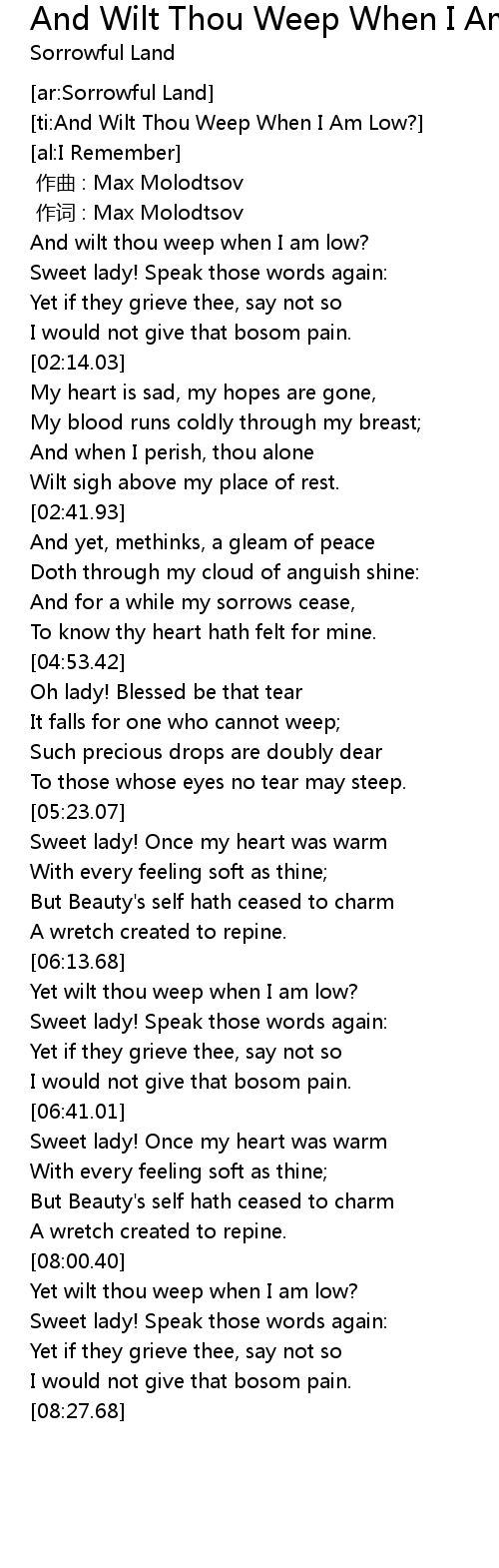 | [08:00.95] | Yet wilt thou weep when I am low? |