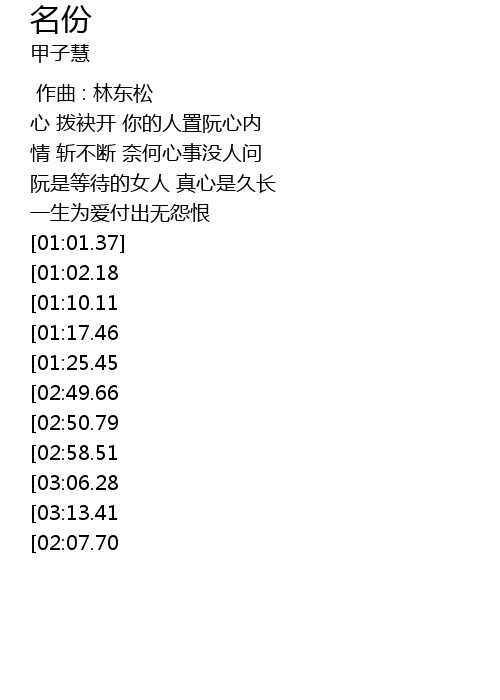 | [03:29.51][02:58.51][01:41.14] | 不免对阮用心机 阮的感情单纯只爱你 |