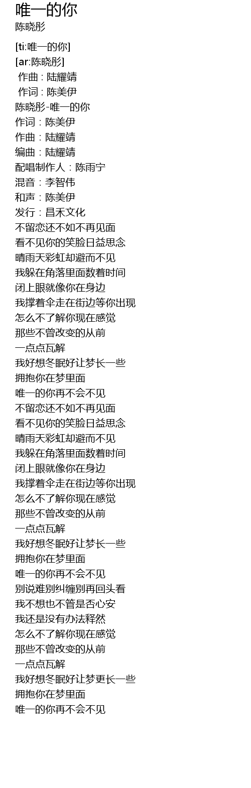 | [00:00.116] | 陈晓彤-唯一的你 |