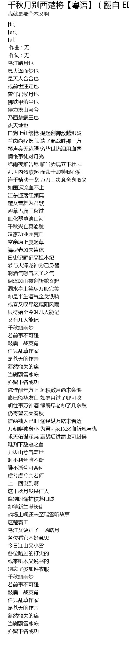 | Song | 千秋月别西楚将【粤语】(翻自 EDIQ) |