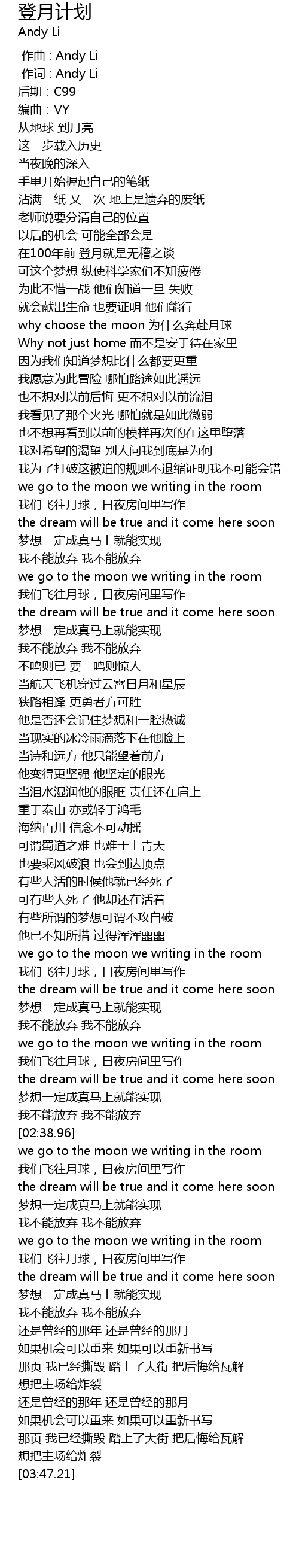 | [03:15.57] | wǒ men fēi wǎng yuè qiú, rì yè fáng jiān lǐ xiě zuò |