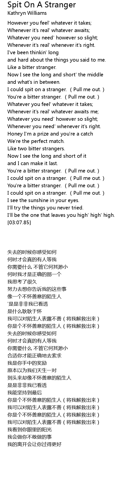 | [01:14.67] | I could spit on a stranger. (Pull me out.) |
