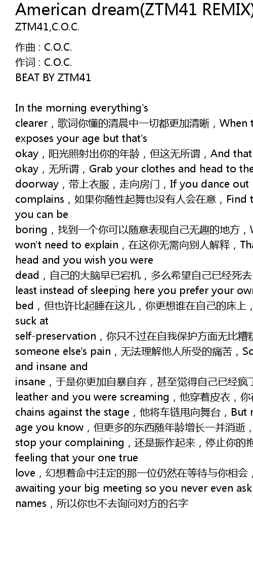 | In the morning everything' s clearer, gē cí nǐ dǒng de qīng chén zhōng yī qiè dōu gèng jiā qīng xī, When the sunlight exposes your age but that' s okay, yáng guāng zhào shè chū nǐ de nián líng, dàn zhè wú suǒ wèi, And that' s okay, wú suǒ wèi, Grab your clothes and head to the doorway, dài shàng yī fú, zǒu xiàng fáng mén, If you dance out no one complains, rú guǒ nǐ suí xìng qǐ wǔ yě méi yǒu rén huì zài yì, Find the place where you can be boring, zhǎo dào yí gè nǐ kě yǐ suí yì biǎo xiàn zì jǐ wú qù de dì fāng, Where you won' t need to explain, zài zhè nǐ wú xū xiàng bié rén jiě shì, That you' re sick in the head and you wish you were dead, zì jǐ de dà nǎo zǎo yǐ dàng jī, duō me xī wàng zì jǐ yǐ jīng sǐ qù, Or at least instead of sleeping here you prefer your own bed, dàn yě xǔ bǐ qǐ shuì zài zhè ér, nǐ gèng xiǎng shuí zài zì jǐ de chuáng shàng, You just suck at selfpreservation, nǐ zhǐ bù guò zài zì wǒ bǎo hù fāng miàn wú bǐ zāo gāo, Versus someone else' s pain, wú fǎ lǐ jiě tā rén suǒ shòu de tòng kǔ, So you feel drained and insane and insane, yú shì nǐ gèng jiā zì bào zì qì, shèn zhì jué de zì jǐ yǐ jīng fēng le, He was leather and you were screaming, tā chuān zhe pí yī, nǐ zài tái xià jiān jiào, Swinging chains against the stage, tā jiāng chē liàn shuǎi xiàng wǔ tái, But now more will go with age you know, dàn gèng duō de dōng xī suí nián líng zēng zhǎng yī bìng xiāo shì, So get up and stop your complaining, hái shì zhèn zuò qǐ lái, tíng zhǐ nǐ de bào yuàn ba, That feeling that your one true love, huàn xiǎng zhe mìng zhòng zhù dìng de nà yī wèi réng rán zài děng dài yǔ nǐ xiāng huì, Is just awaiting your big meeting so you never even ask for names, suǒ yǐ nǐ yě bù qù xún wèn duì fāng de míng zì |
