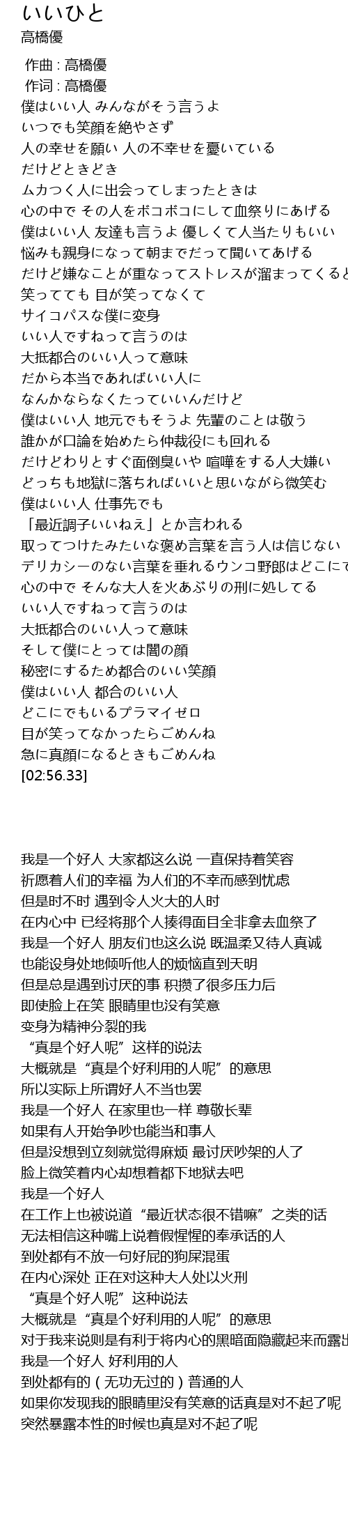 | [00:42.68] | 僕はいい人 友達も言うよ 優しくて人当たりもいい |