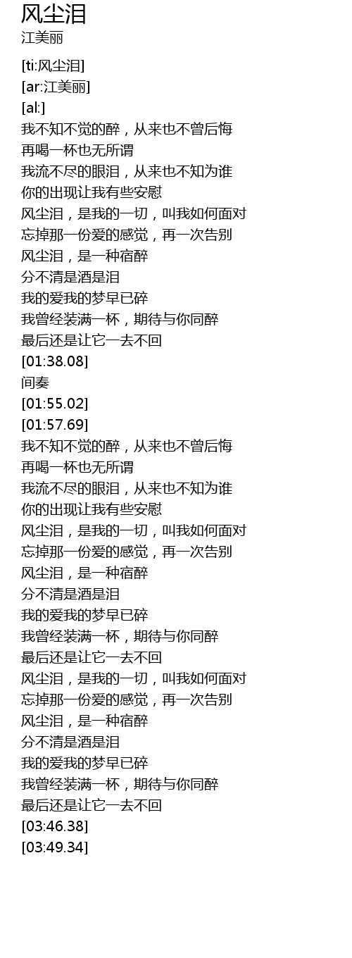 | [00:59.47] | 风尘泪,是我的一切,叫我如何面对 |