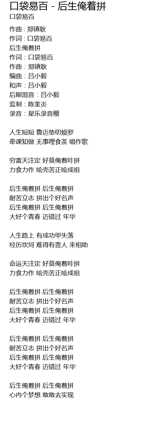 | Song | 口袋易百 - 后生俺着拼 |