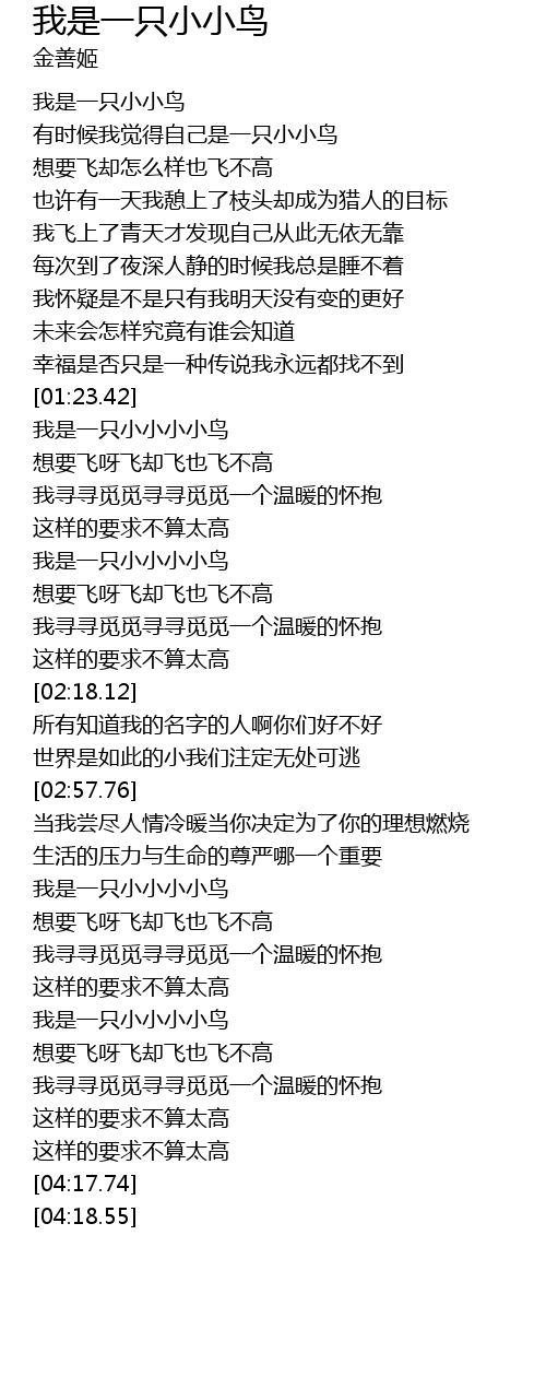 | [03:40.04] | wǒ shì yì zhī xiǎo xiǎo xiǎo xiǎo niǎo |