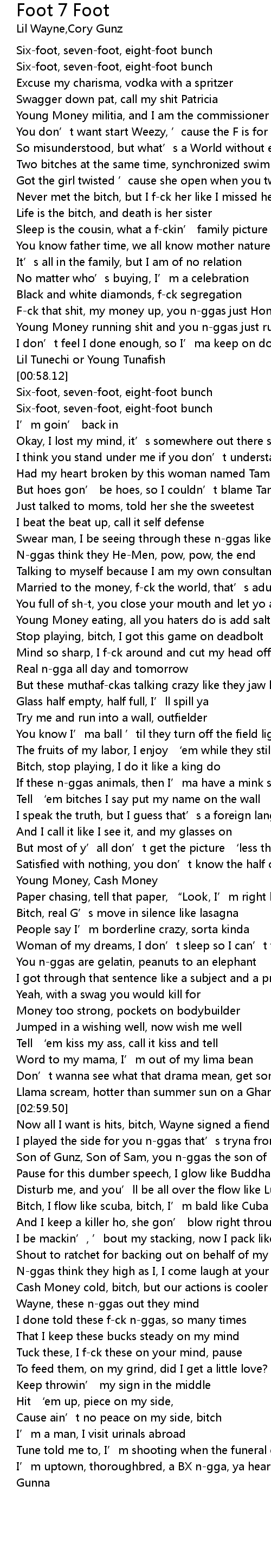 | [00:06.43] | Six-foot, seven-foot, eight-foot bunch |