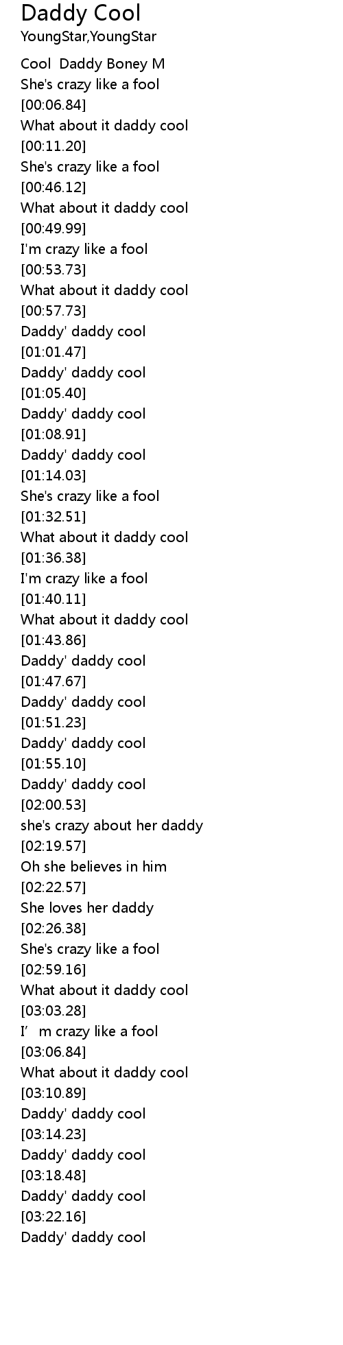 | [03:00.78] | What about it daddy cool |