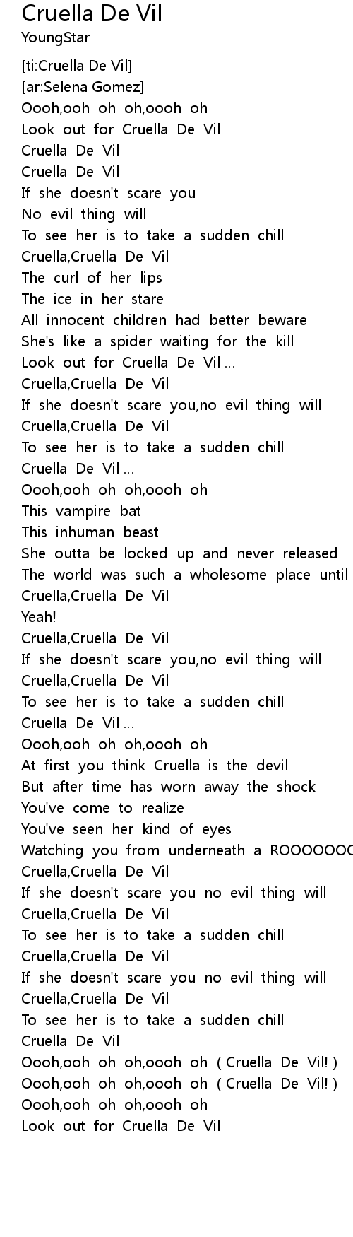 | [03:01.93] | Oooh, ooh oh oh, oooh oh Cruella De Vil! |