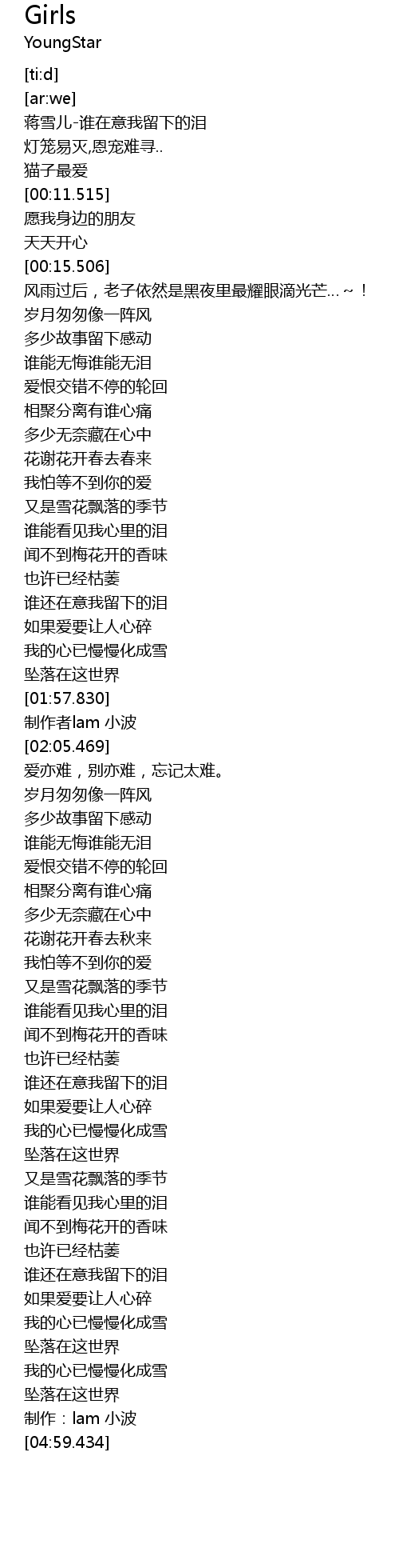 | [00:03.209] | jiǎng xuě ér shuí zài yì wǒ liú xià de lèi |