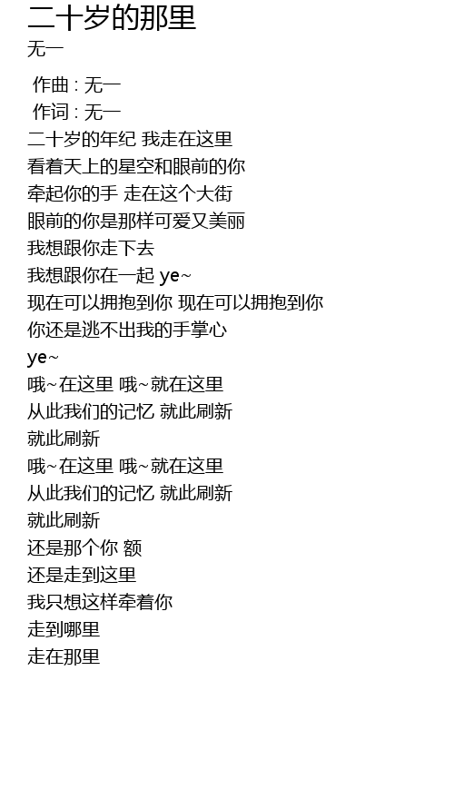 | [00:09.431] | 二十岁的年纪 我走在这里 |