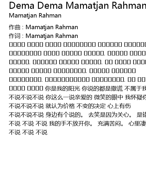 | دىمە دىمە دىمە ئۆمەرجان پىنھان يازمىسى كۆزۈمنىڭ نۇرى دىسەم مىنىڭ. سۆزۈڭ يالغان سىنىڭ. مەنسۇپ ئەمەس جېنىڭ. ھە دىمە دىمە دىمە. جېنىم دىگەن سۆزۈڭدىن. كۈلۈپ تۇرغان كۆزۈڭدىن. گۇمانلاندىم ئۆزۈڭدىن. ھە دىمە دىمە دىمە 你是我的阳光 你说的都是撒谎 不属于我的你 不说不说不说 你这么一说亲爱的 微笑的眼中 我怀疑你自己 不说不说不说 就认为价格 不变的决定 心上有伤 不说不说不说 身边有个说的。 去笑是因为关心。 是错的。 不说 不说 不说 我的手不放开你。 充满苦闷。 心里凄苦了。 不说 不说 不说 |