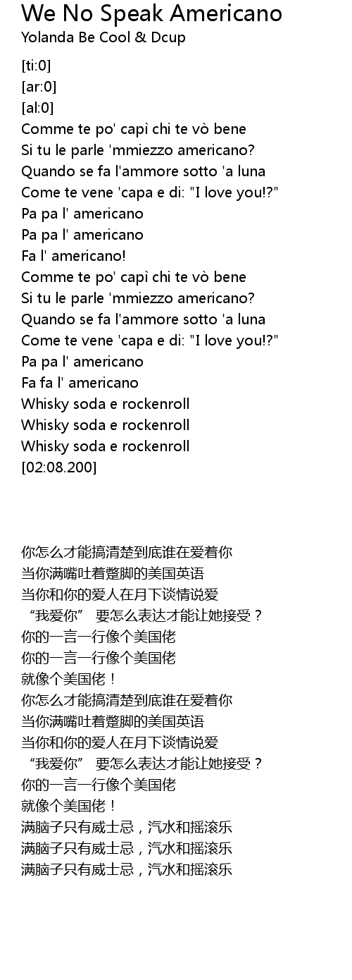 | [00:05.650] | Si tu le parle 'mmiezzo americano? |