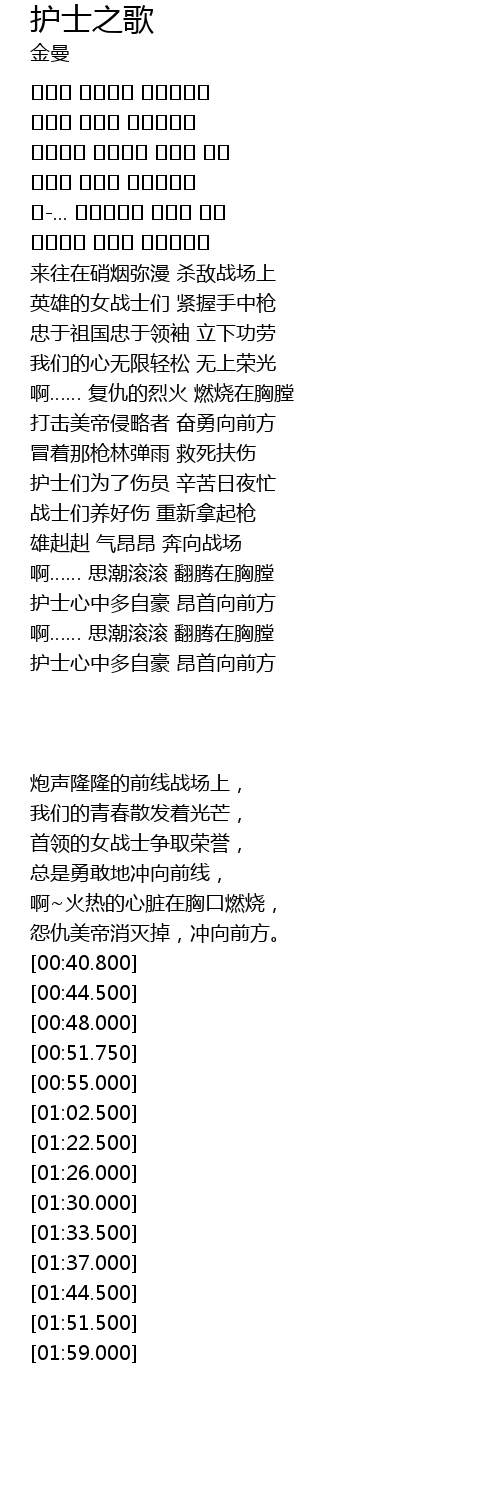 | [01:26.000] | 护士们为了伤员 辛苦日夜忙 |