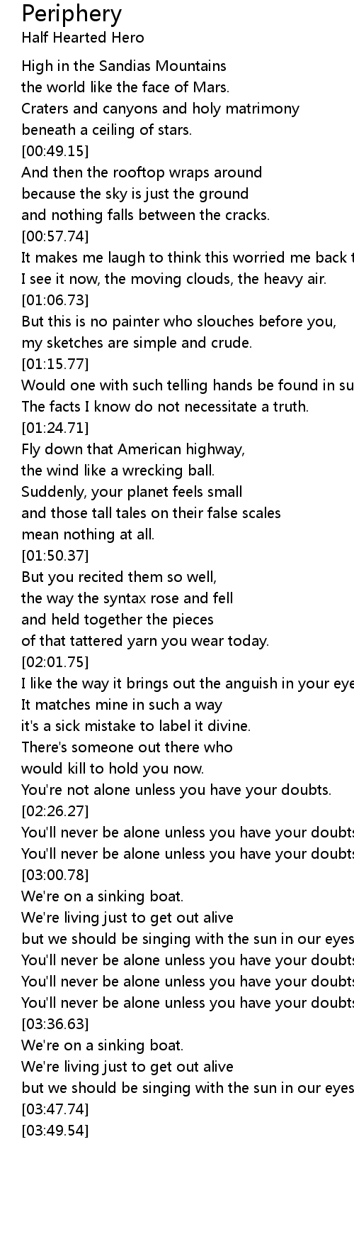 | [03:21.27] | You'll never be alone unless you have your doubts.(x3) |