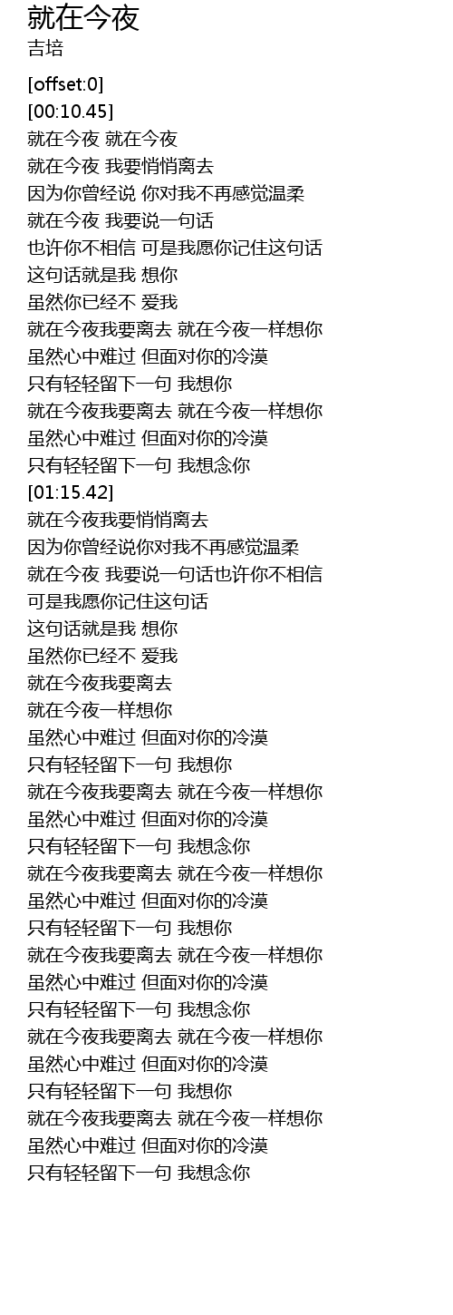 | [01:02.16] | 就在今夜我要离去 就在今夜一样想你 |