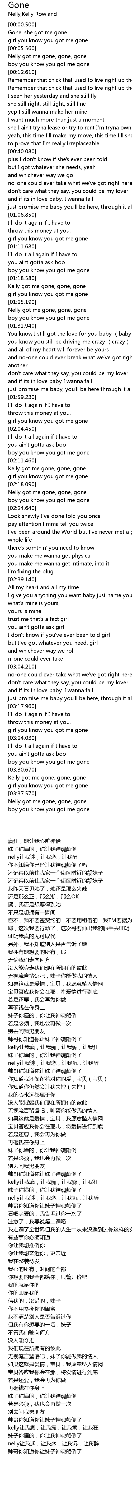 | [02:18.380] | Nelly got me gone, gone, gone |