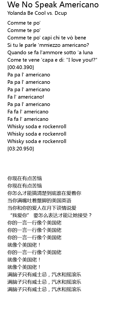 | [00:30.000] | Si tu le parle ' mmiezzo americano? |
