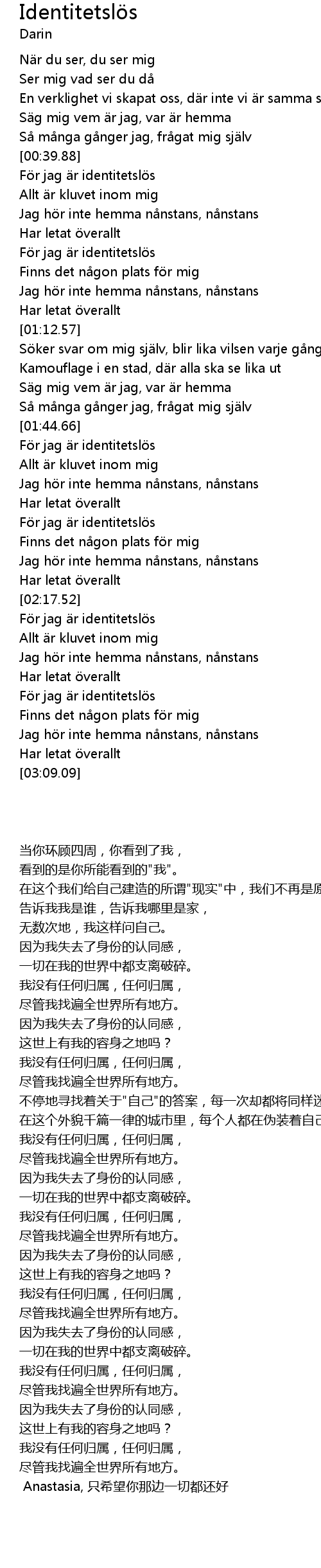 | [01:13.73] | Söker svar om mig själv, blir lika vilsen varje gång |