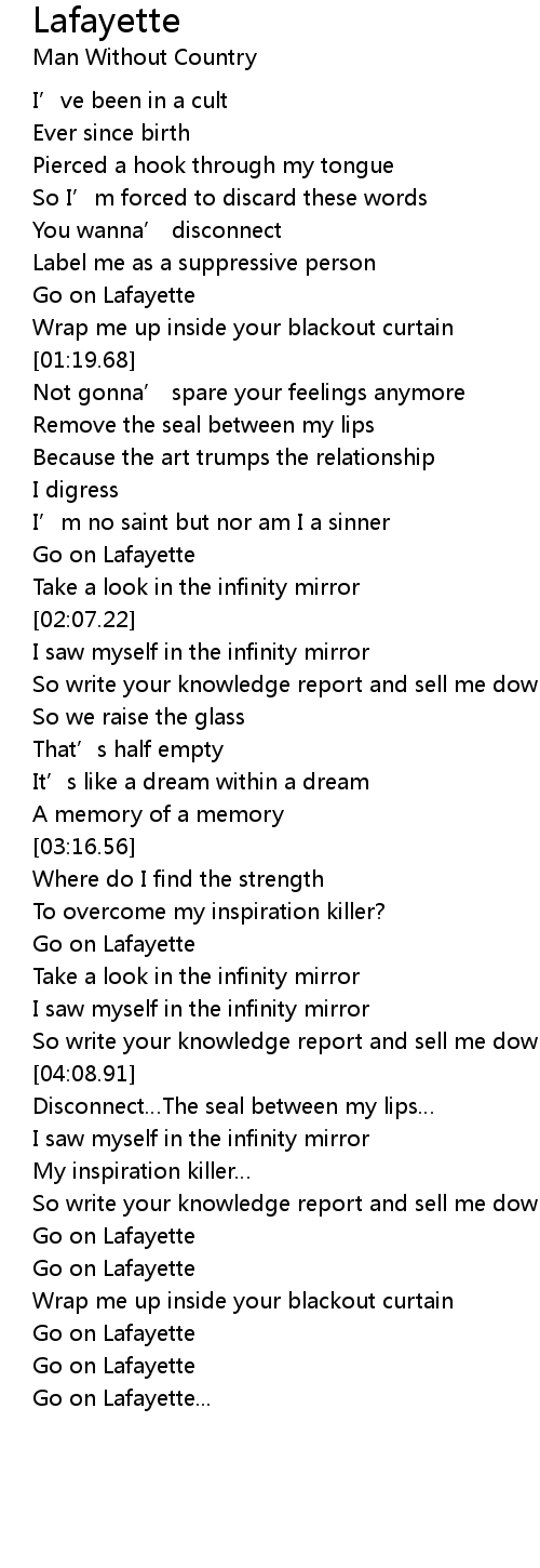 | [01:57.43] | Go on Lafayette |