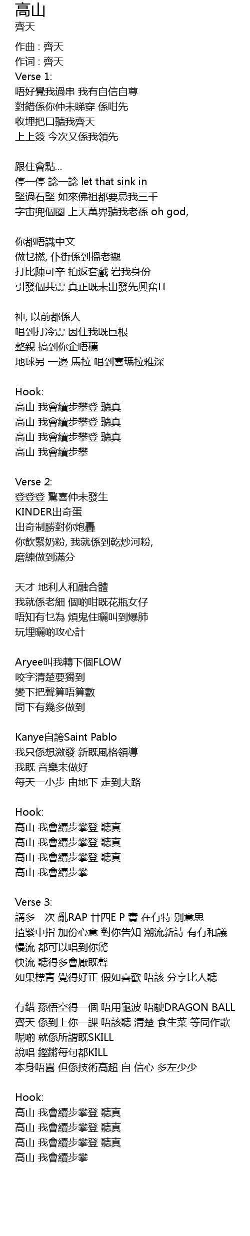 | 齊天 係到上你一課 唔該聽 清楚 食生菜 等同作歌 | |