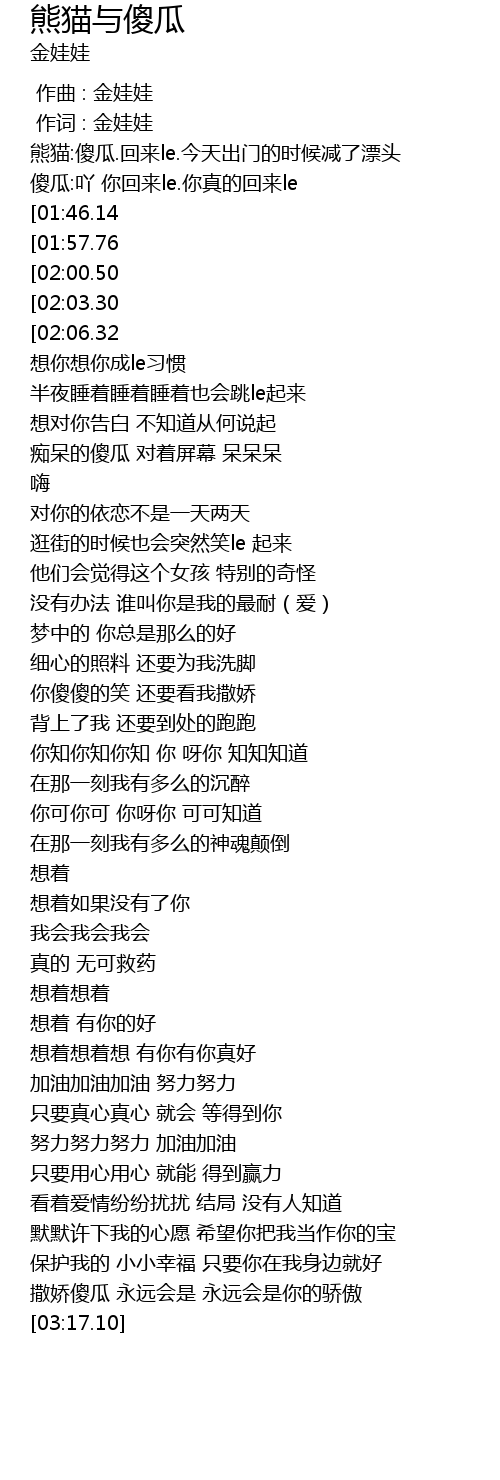 | [02:31.71][01:46.14][01:01.23][00:15.86] | xióng māo xióng māo xióng māo xióng māo... |