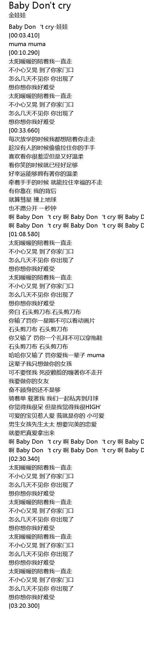 | [02:19.990] | 啊 Baby Don‘t cry 啊 Baby Don‘t cry 啊 Baby Don‘t cry |