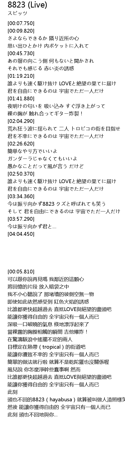 | [03:24.810] | 君を自由にできるのは 宇宙でただ一人だけ |